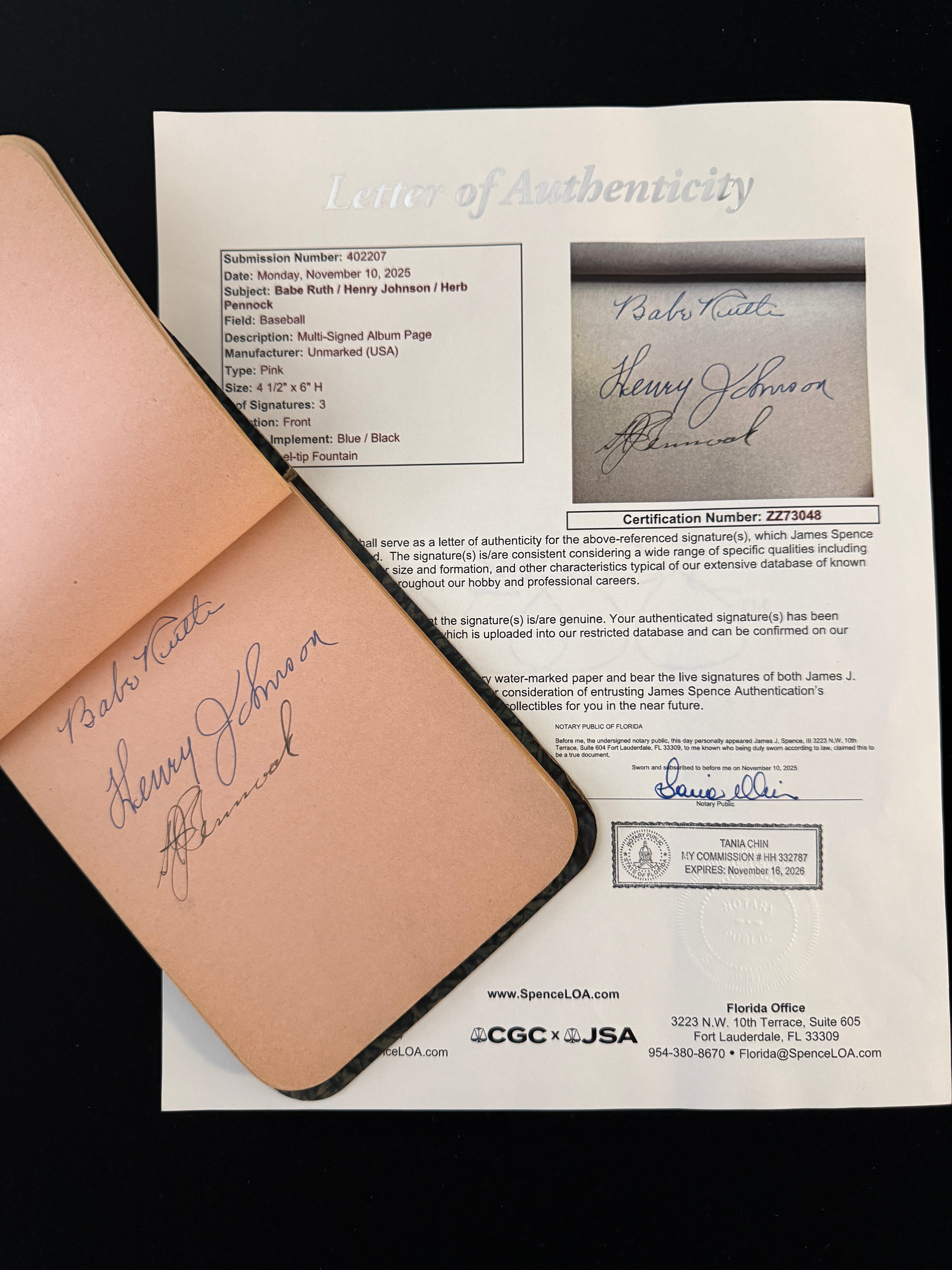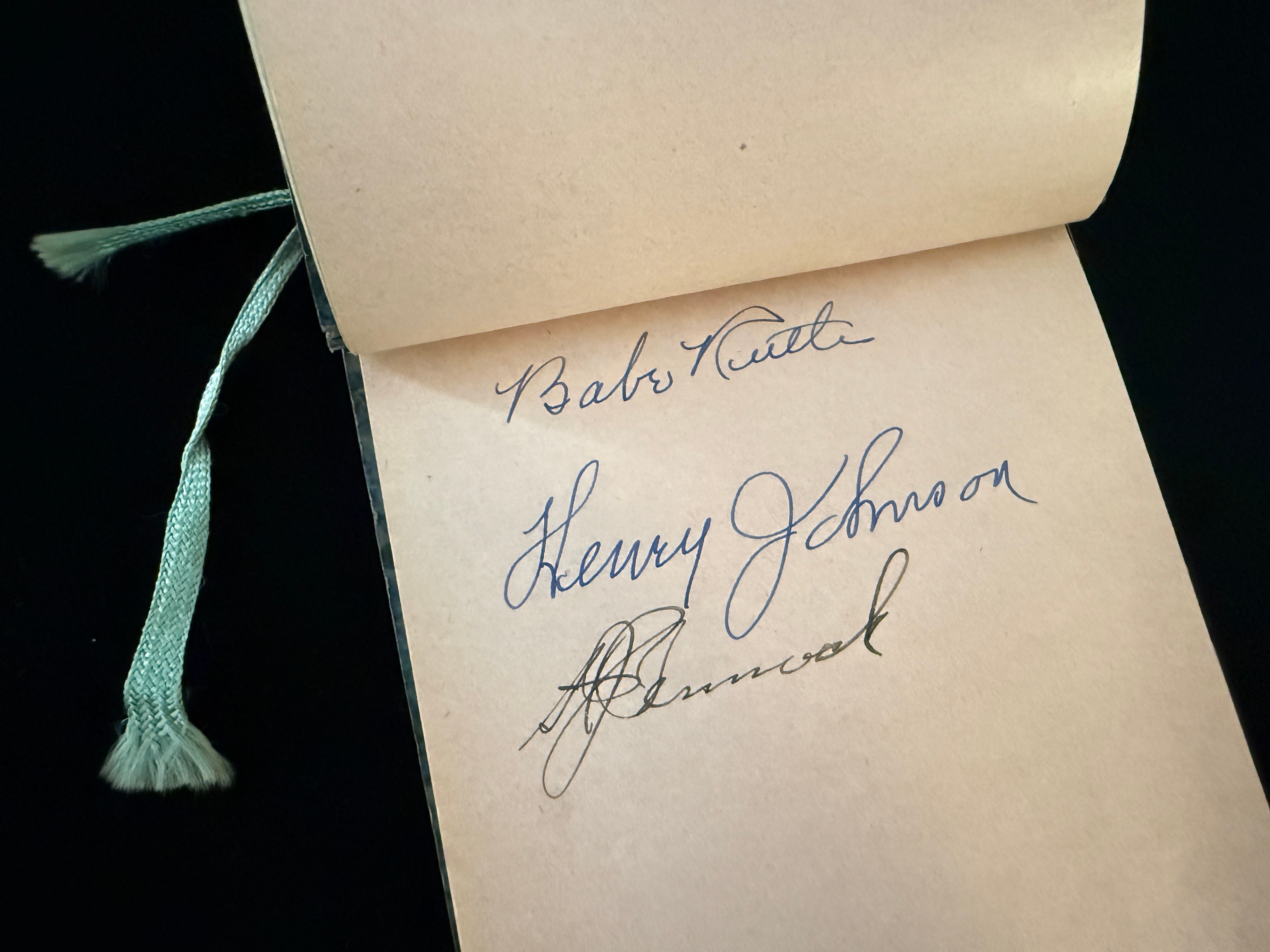 While there are many iconic signatures in the book—ranging from “The Gray Eagle” Tris Speaker to “Iron Horse” Lou Gehrig—the headliner here was Babe Ruth, whose signature has great eye appeal, making him the star of the book.
