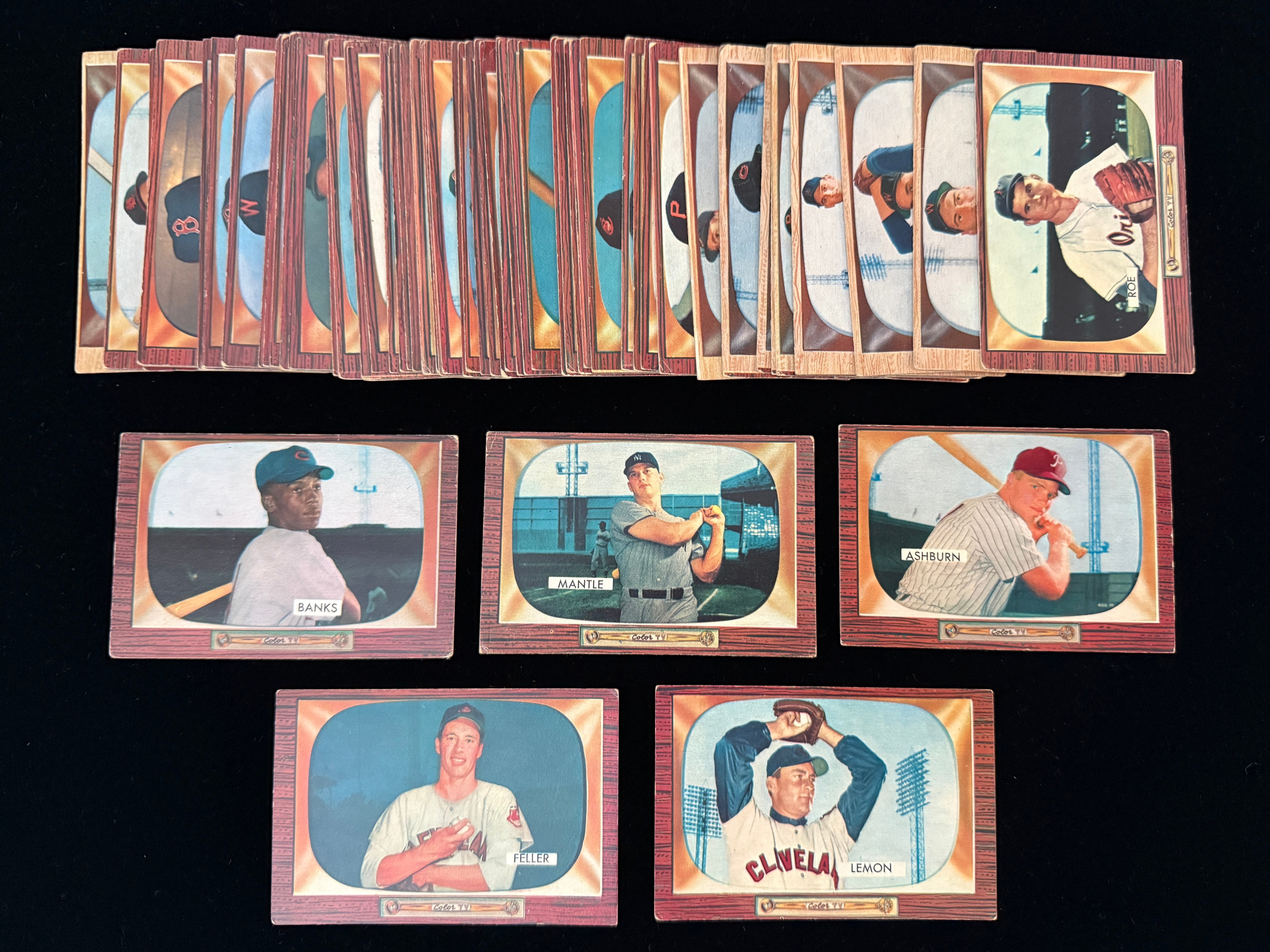 Russ' dad collected a few of our favorite baseball sets! The majority of the cards in this collection are from the 1955 Bowman baseball set. Bowman released 320 cards that year, each measuring 2-1/2" by 3-3/4” - just slightly bigger than a standard card these days of 2-1/2" by 3-1/2" in size. The design of the card is of a TV set! Remember floor models? Well before cable, no remotes, and you had to "warm up the TV"? The first photo below has the star of the show: Mickey Mantle. The Mick is a thee-time MVP who won seven World Series championships with his New York Yankees. Mantle is one of the most famous baseball players of all-time, and if you're looking for a card of The Mick from 1955, this Bowman was your go-to! Topps did not have a contract with Mantle in either 1954 or 1955; you had to get Mick on Bowman! The second photo below has a few more Hall of Famers including Mr. Cub, Ernie Banks, Richie Ashburn, Bob Feller, and Bob Lemon.