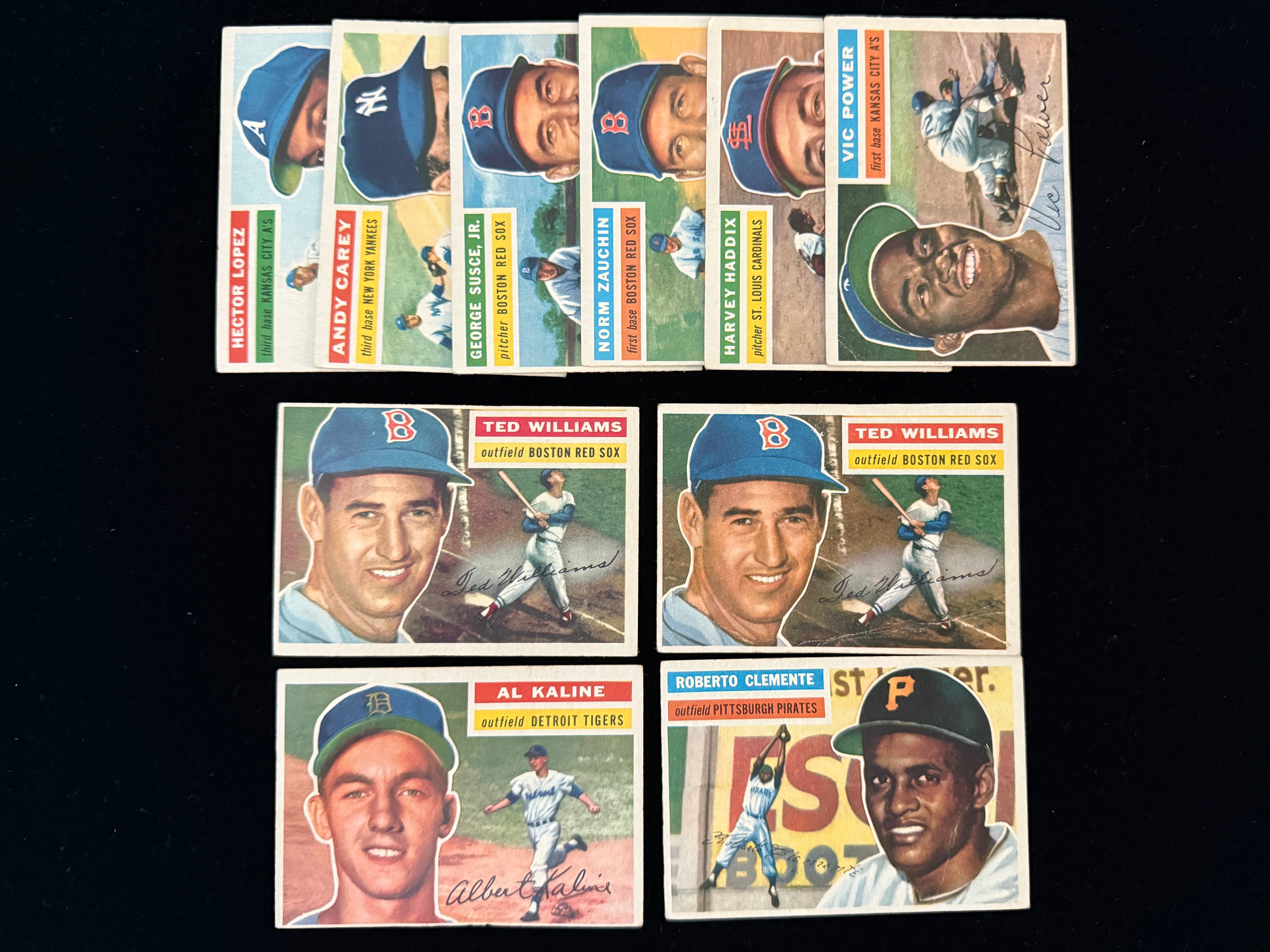 1956 Topps baseball cards shine in the third photo. Much like the 1955 Bowman cards, Topps produced each card in a horizontal design in 1956. Each card features portrait and an action photo! A complete set of 1956 Topps cards consists of 340 cards, with each measuring 2-5/8" by 3-3/4". Russ' dad didn't have a complete set, but did collect a few icons of the diamond! TWO cards of Ted Williams, the last player to bat over .400. Below Teddy Ballgame is Al Kaline and Roberto Clemente.