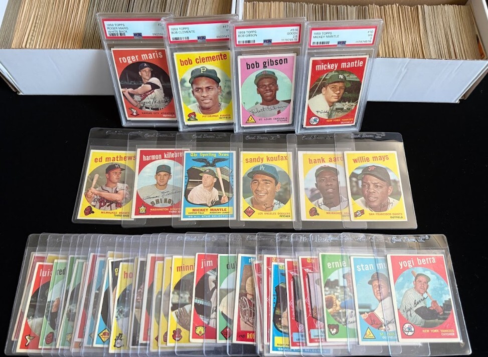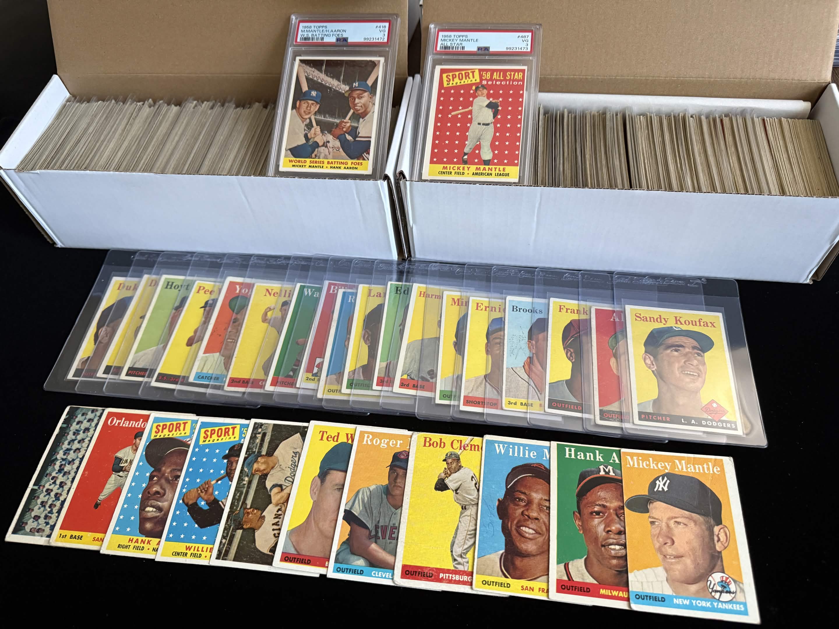 By 1958, with Topps enjoying no competition after the Bowman acquisition, its baseball set expanded to 494 cards. The cards featured nine different solid color backgrounds with player portraits and team logos in the lower right corner. Key cards, of course, include Mantle, Hank Aaron and Willie Mays, all of which are featured in the collections that Bill brought to us. It’s safe to say that with a legacy of cards like this, Bill’s passion will be felt by many more collectors in the future!