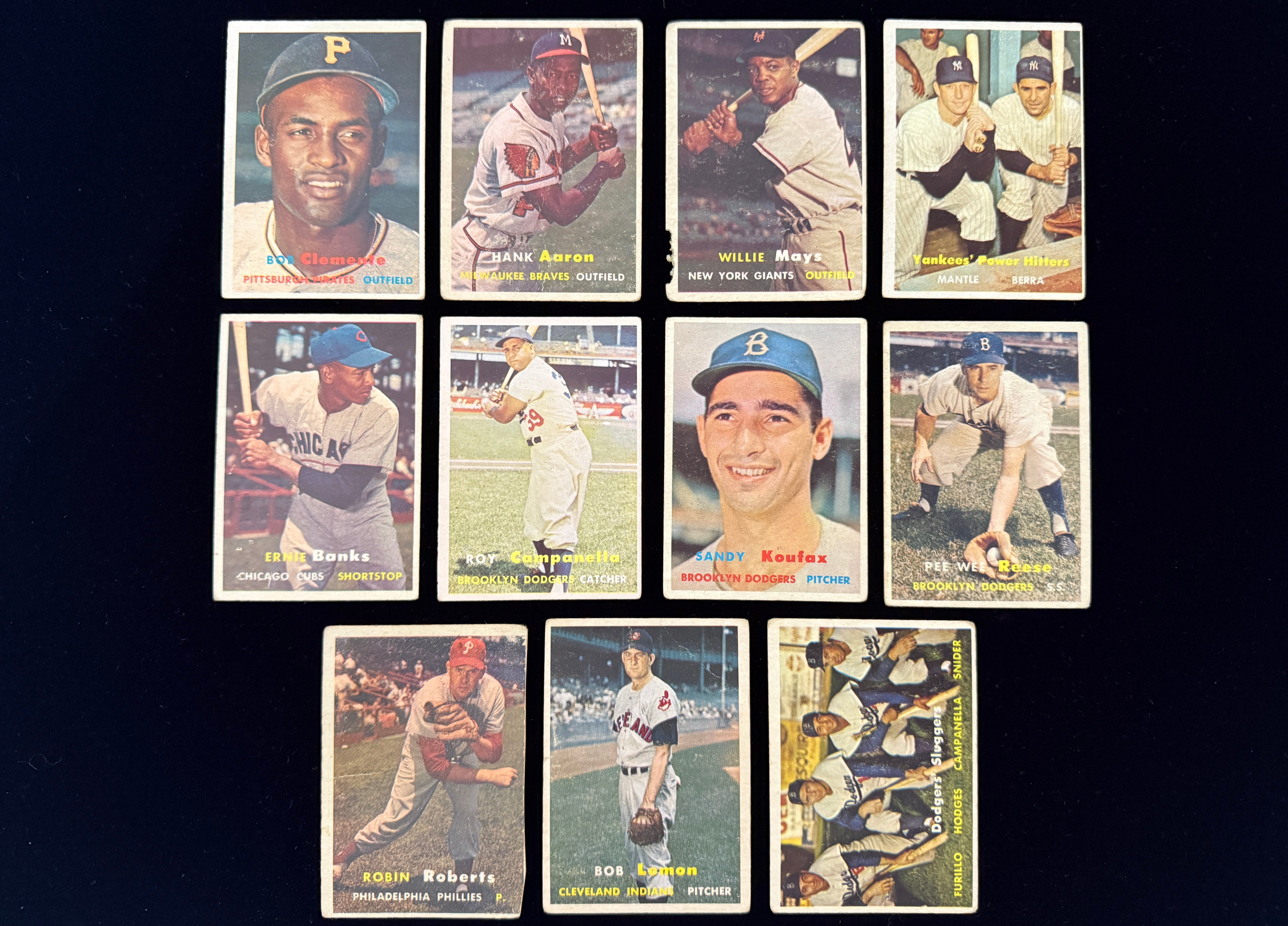 As you review the photos below, you can see the actual box and contents in the first two pictures. In the third picture, you can see we placed the Mantle and Aaron cards in Card Savers for protection. Stars from the 1957 Topps set include Roberto Clemente, Hank Aaron, and Willie Mays in the fourth photo. The fifth photo is another who's who of baseball including more cards of Mays, Aaron, and Mantle, as well as Yogi Berra, Frank Robinson, and the run of Ed Mathews duplicates. The final two photos include the run of Nellie Fox cards, and the All-Star cards from the 1958 Topps set.
