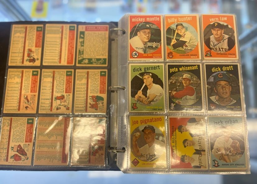 Surprise sets? YES! Margot was not aware her husband had completed full sets. A few key sets stored in binders were 1954 Bowman baseball, 1957 Topps baseball, 1958 Topps baseball, 1959 Topps baseball cards, and 1962 Topps baseball cards. The next five photos show each set in a binder, one of the ways we recommend to safely store your cards. While we would love each card to always be MINT, we have an appreciation for this collection by seeing each card in the binder; we know that George loved collecting! Holding cards he may have pulled himself out of packs as a kid. The "collectors" grade is what we call a "well loved" card. Perhaps, as a young collector yourself, you would put a rubber band around a stack and toss those cards in a shoebox - you, like us, we're a collector, and your cards were in that "collector's grade." Days when a pack of Topps baseball cards set you back a nickel, gas was about 30 cents a gallon (what we wouldn't give...), and the only way you knew a player's stats were by reading the back of their card!