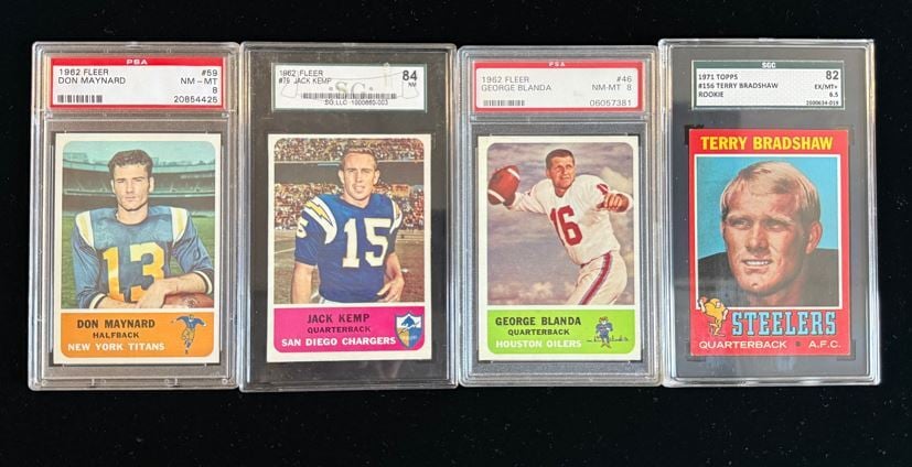 As your eyes move to the next couple of photos, you see cards from the 1966 Topps football set including THREE cards of Joe Namath! Leighton is a Jets fan so he can't pass up a Broadway Joe card. Hall of Fame names continue including a 1972 Topps rookie card of four-time Super Bowl champion, Terry Bradshaw in the 14th photo below.