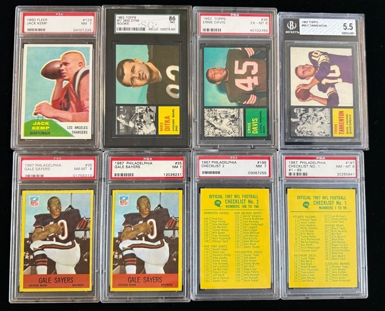Da Bears! Mike Ditka's rookie card is found in 1962 Topps and George had one Chicago icon in the collection. Next to Ditka is an Ernie Davis rookie card from the same set. Tragically, Davis passed away from cancer at the age of only 23. Davis won the Heisman Trophy at Syracuse and was the number one pick in the draft by the Washington Redskins and traded to the Cleveland Browns.