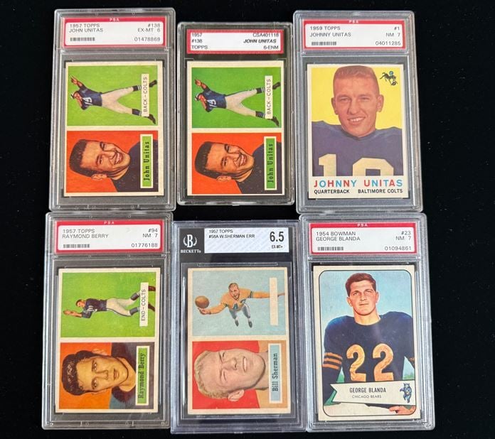 George also collected football cards and like the baseball names, you see a who's who of the gridiron! Starting off the football collection is a run of Jim Brown cards. Brown won Rookie of the Year, the MVP three times, and led the league in rushing eight times - and only played nine seasons. Let that sink in for a second - he played 9 years and was the best runner for 8. TWO Brown rookies from the 1958 Topps football set! Vintage football continues and in the next photo is a pair of Johnny Unitas rookie cards from the 1957 Topps football set. Before Peyton Manning, Johnny U set the records at QB for the Colts. Unitas won Super Bowl V, three NFL Championships, and was named league MVP three times.