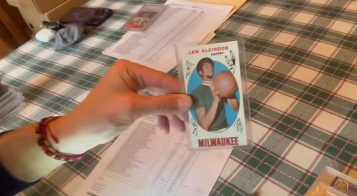 A few vintage basketball cards were in the collection including a 1969 Topps "Tall Boys" rookie card of Kareem Abdul-Jabbar. Topps made the 99-card set 2-1/2” by 4-11/16”, in size, much bigger than a standard-card size today of 2-1/2" by 3-1/2". You can see how tall the cards cards are as Leighton holds the Kareem rookie. Kareem won SIX MVP awards, and won six NBA Championships on the way to retiring as the all-time leading scorer in NBA history.