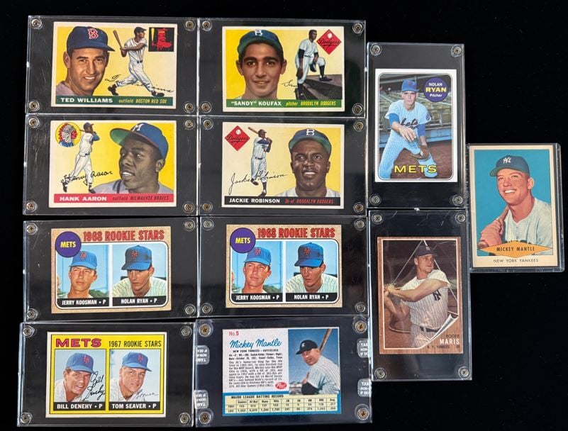 Mickey Mantle steals the show in the second photo. The three-time MVP and seven-time World Series champion for the New York Yankees has a run of cards here including 1954 Bowman (first card) and 1968 Topps (last card). The 1968 Topps set not only features Mantle from the last year he played a game, but also includes the rookie card of young fireballer named Nolan Ryan! In the third photo you can see a pair of Nolan Ryan rookies. In the same photo are other icons including Jackie Robinson, Hank Aaron, Tom Seaver's rookie card, and a 1954 Red Heart Mickey Mantle. How popular were baseball cards in the 1950's? So much so that Red Heart, a DOG FOOD company, released a 33-card set including The Mick.