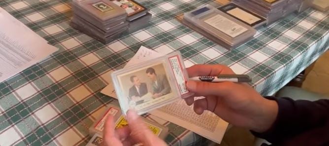 The ninth photo is a PSA 6 card from the 1959 Fleer Ted Williams set. Teddy Ballgame had a set dedicated solely to him, but it isn't him on the card which makes this one valuable! Leighton explains that Bucky Harris is on the card with Williams, and Bucky had an exclusive contract with Topps. Fleer had to stop production on card #68, "Ted Signs." At Just Collect, we do more than appraise and purchase collections; we want to help you learn about cards! This is one of the many reasons we bring you The Set of the Week series; you can learn about rare sets like 1914 T222 Fatima cards.
