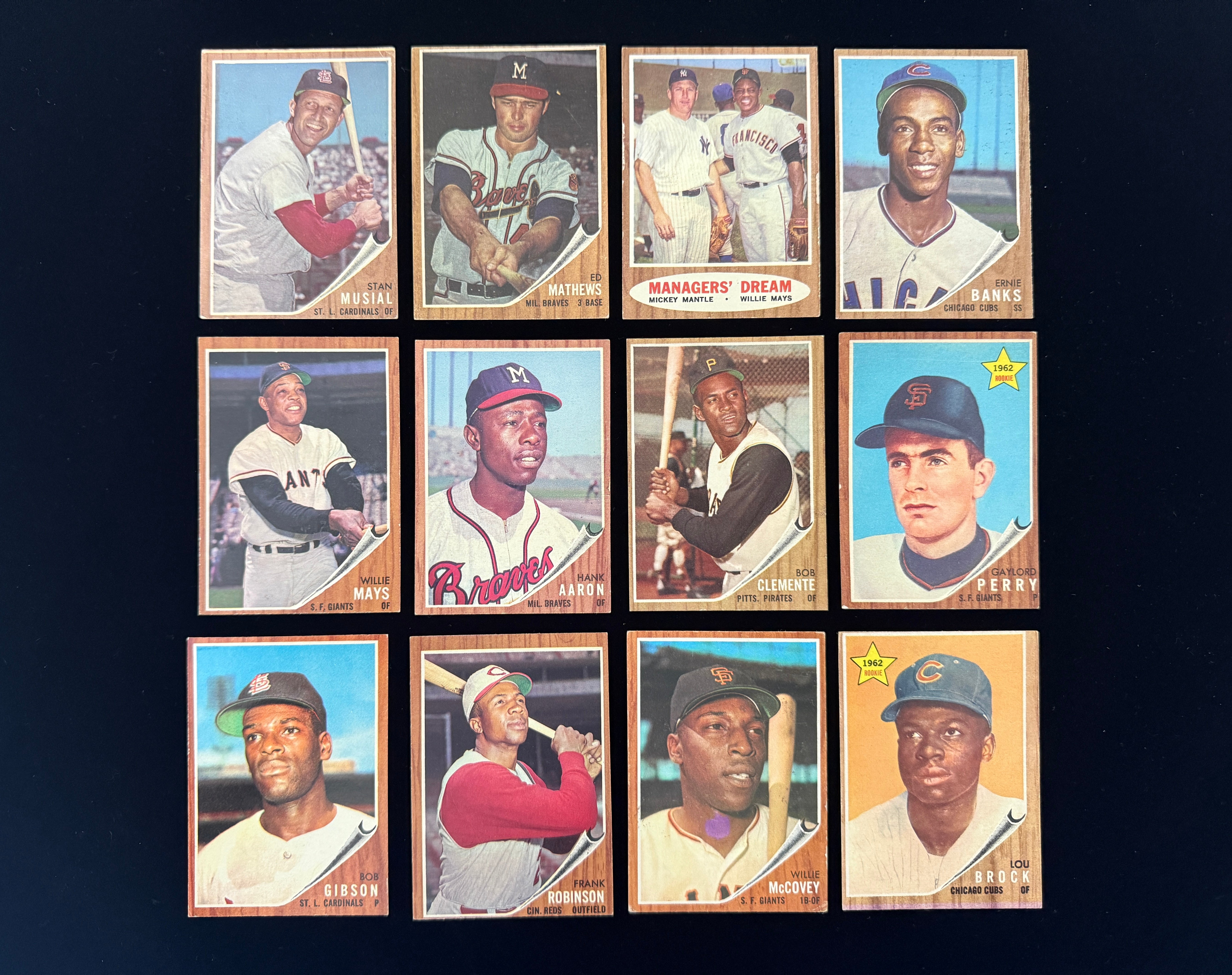 The last three photos below are of the 1962 Topps baseball set. Remember the 1987 Topps set with wood borders you had as a kid? Your dad had a set just like that, but these came out in 1962! Topps released 598 cards in this set, making room for a who's who of baseball royalty. Mantle, Aaron, Mays, and Clemente are in the set, and so are Sandy Koufax, Ernie Banks, Yogi Berra, Bob Gibson, and more legends!