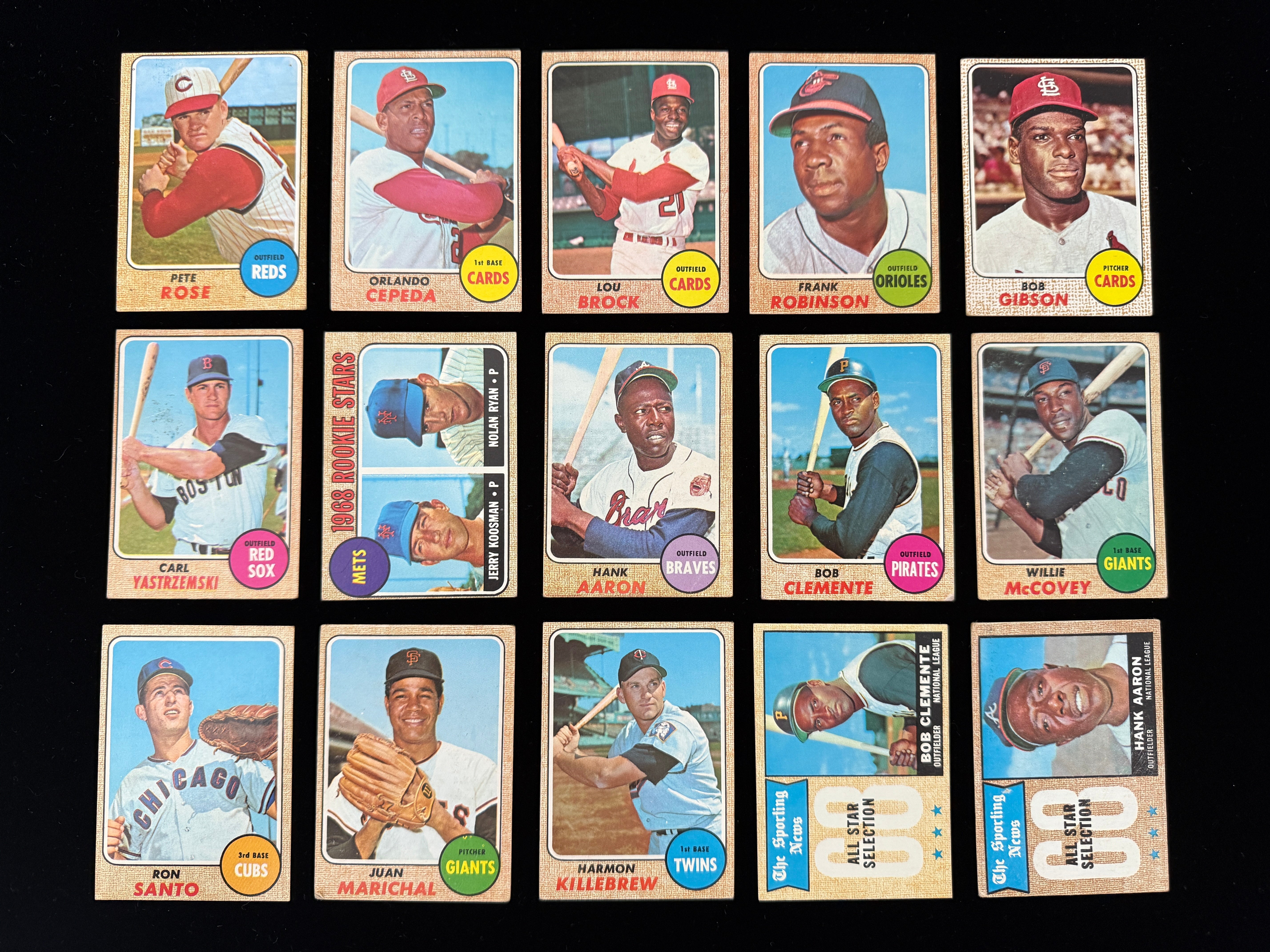 A pair of rookies standout in the 1968 Topps cards you see in the final photo: Nolan Ryan and Johnny Bench! Topps released this 1968 set with the same number of cards as the 1962 set, and included all the stars you just read about - Mantle, Aaron, Mays, and more. Card #177 features future Hall of Famer Nolan Ryan as a rookie, sharing his card with Jerry Koosman. Card #257 is a rookie Johnny Bench who shares a card with Ron Tompkins.